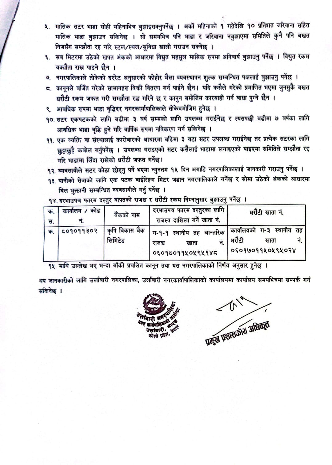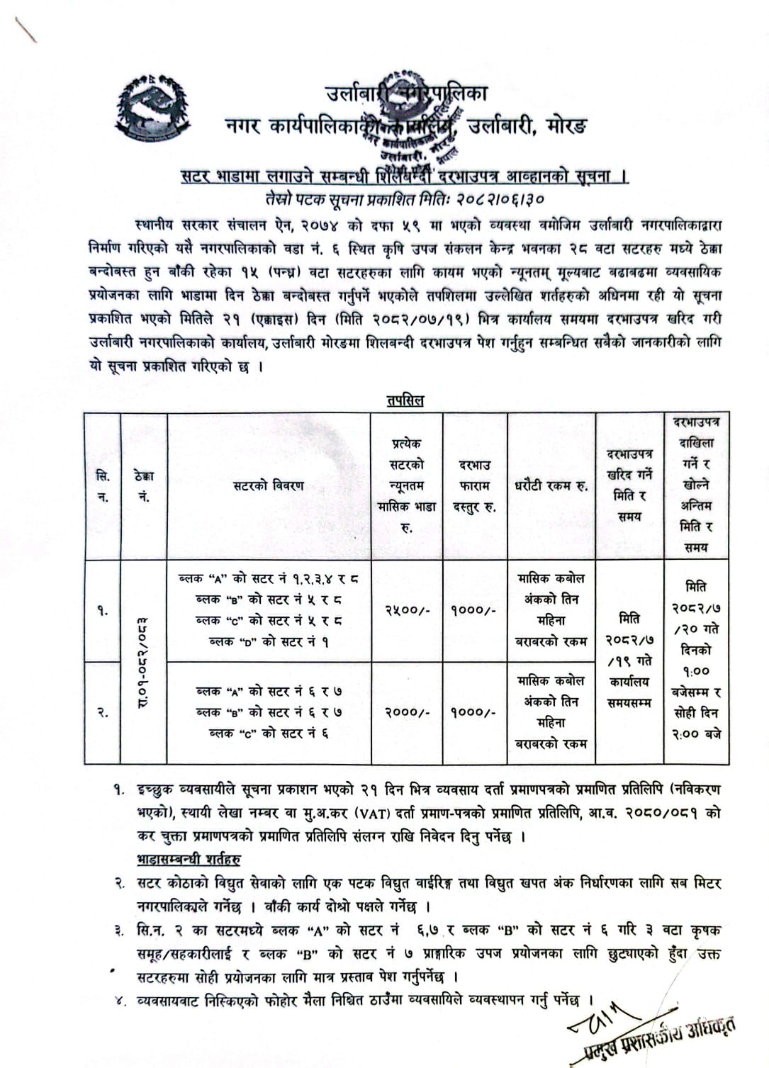 » सटर भाडामा लगाउने सम्बन्धी शिलबन्दी दरभाउपत्र आव्हानको सूचना । तेस्रो पटक सूचना प्रकाशित मितिः २०८२।०६।३०