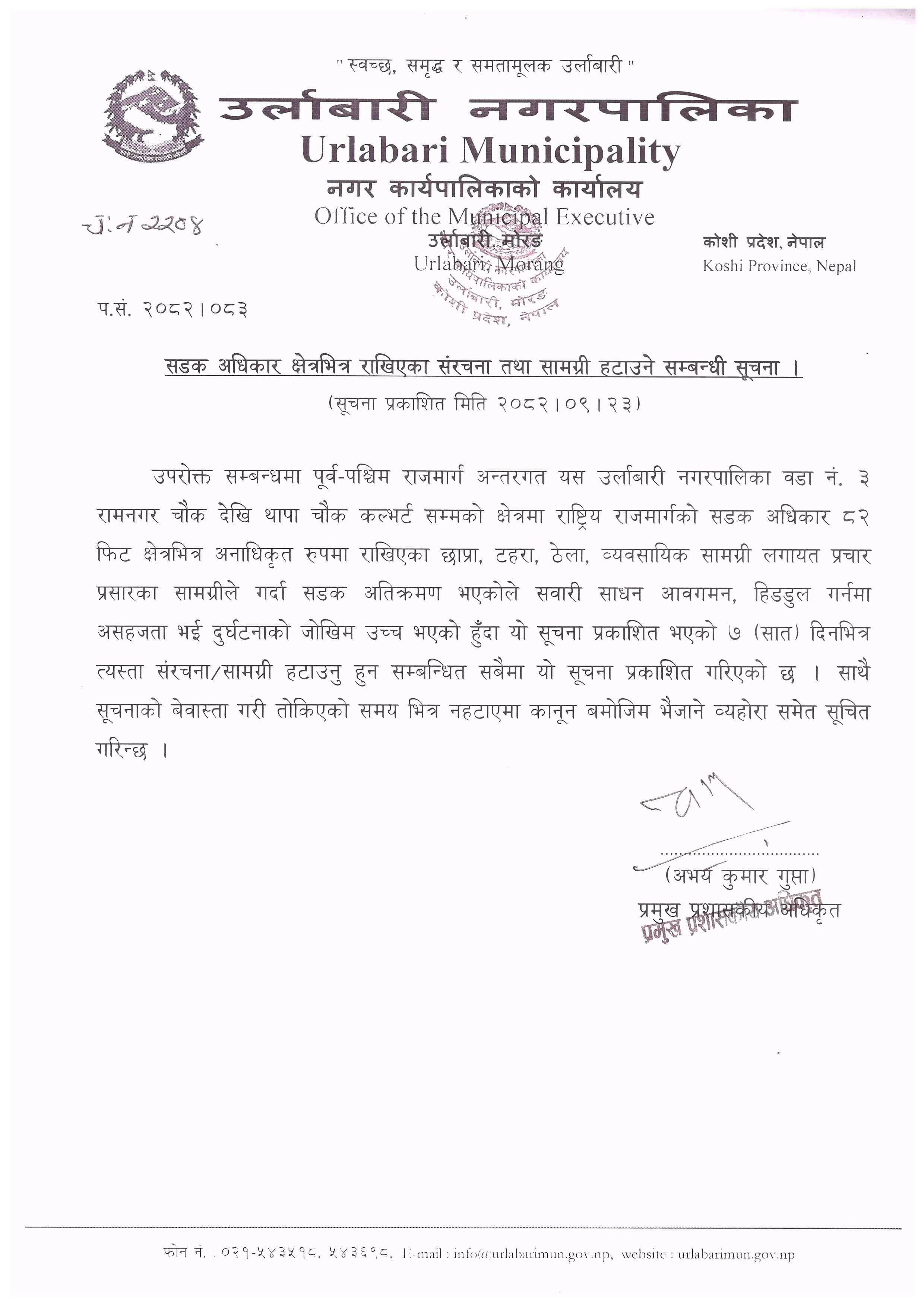 सडक अधिकार क्षेत्रभित्र राखिएका संरचना तथा सामग्री हटाउने सम्बन्धी सूचना ।