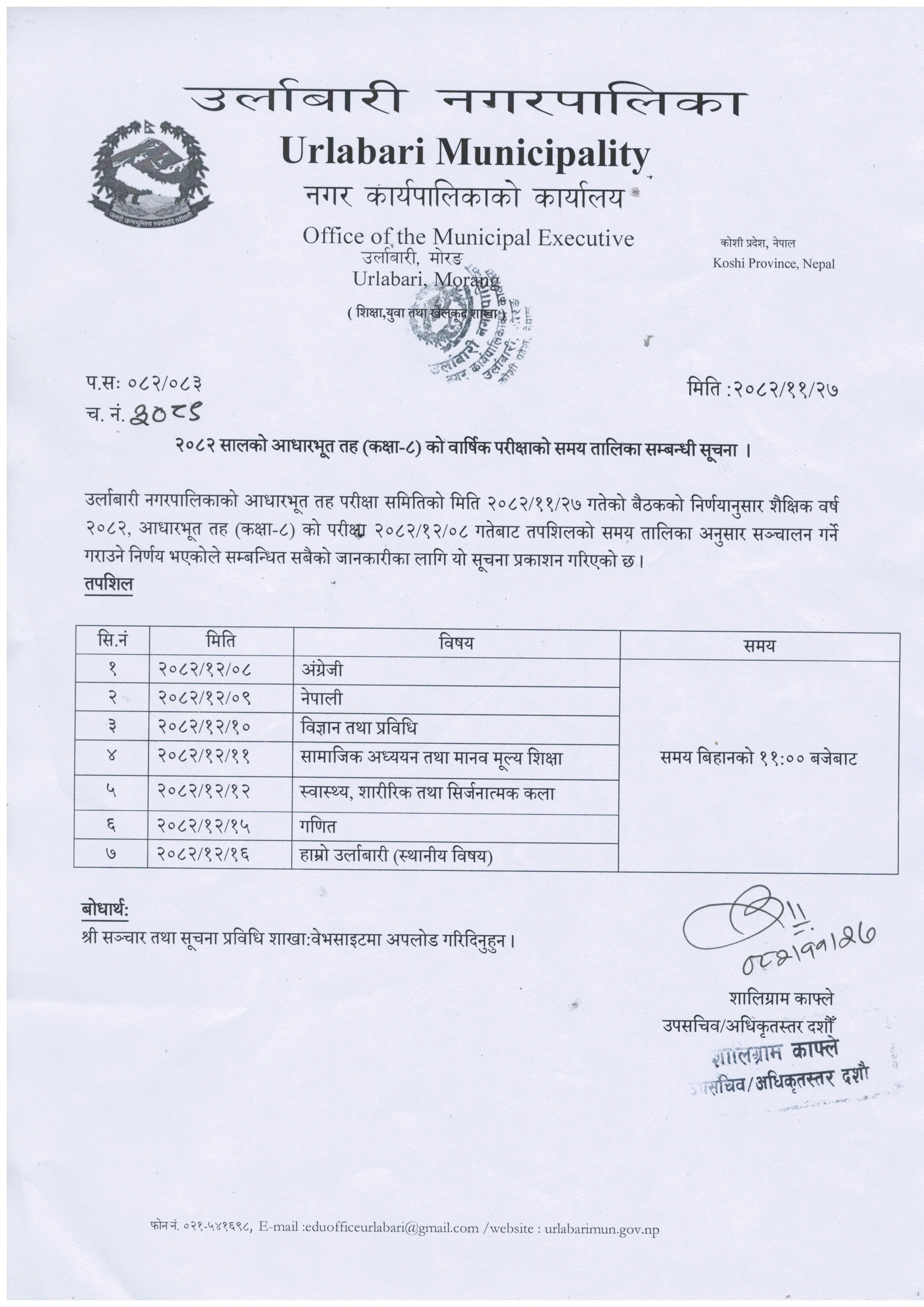 २०८२ सालको आधारभूत तह(कक्षा-८) को वार्षिक परीक्षाको समय तालिका सम्बन्धी सूचना ।