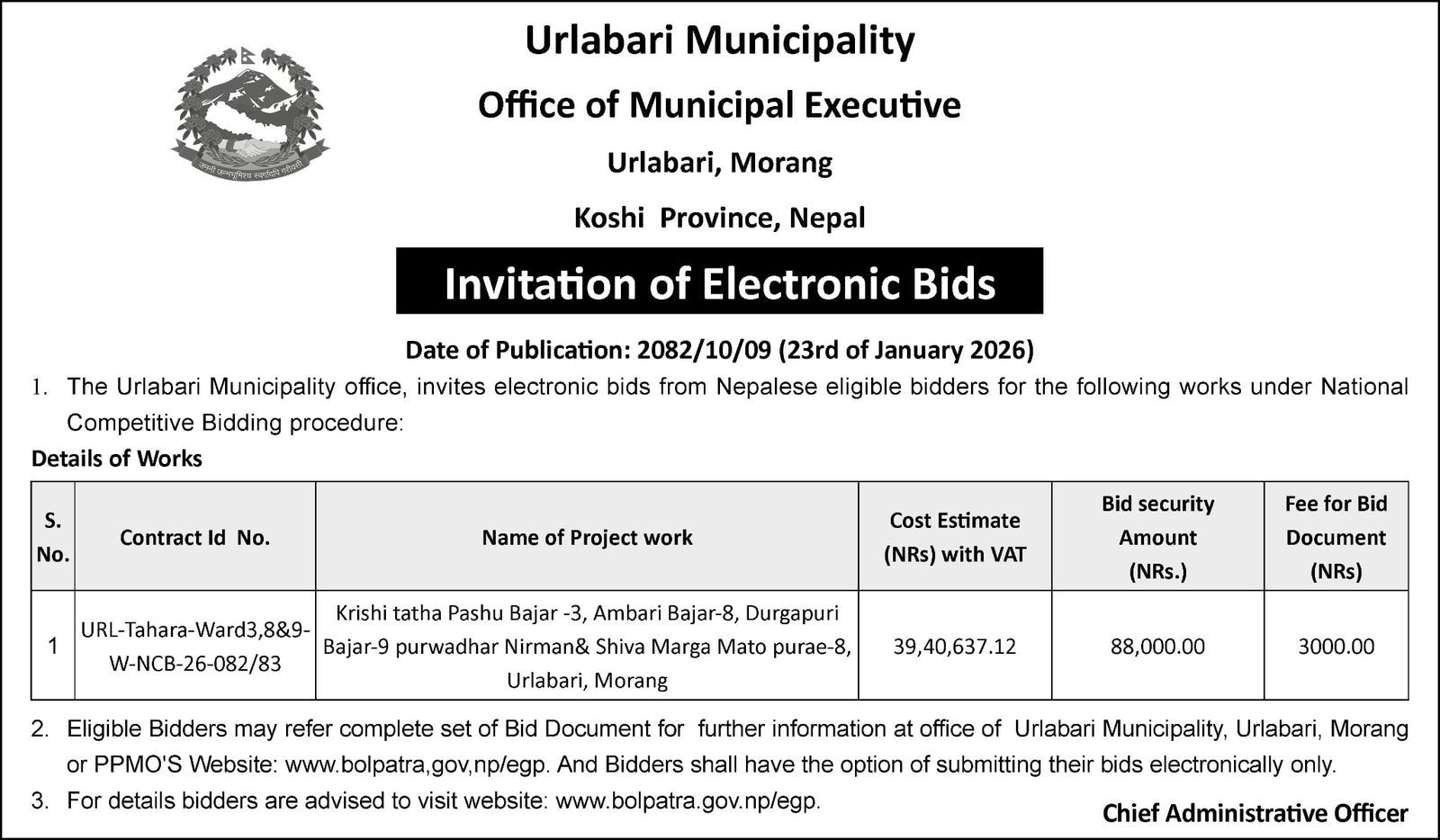 Invitation of Electronic Bids (Krishi tatha Pashu Bajar -3,Ambari Bajar- 8,Durgapuri Bajar-9 purwadhar Nirman& Shiva Marga Mato purae- 8,Urlabari,Morang)