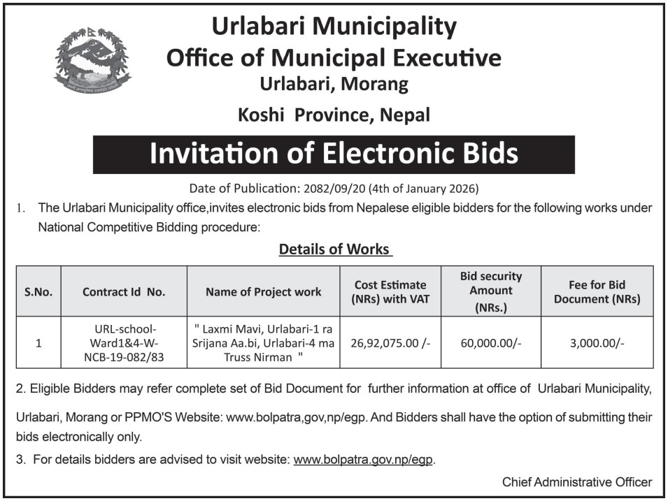 Invitation of Electronic Bids (Laxmi Mavi, Urlabari- 1 ra Srijana Aa.bi, Urlabari-4 ma Truss Nirman)