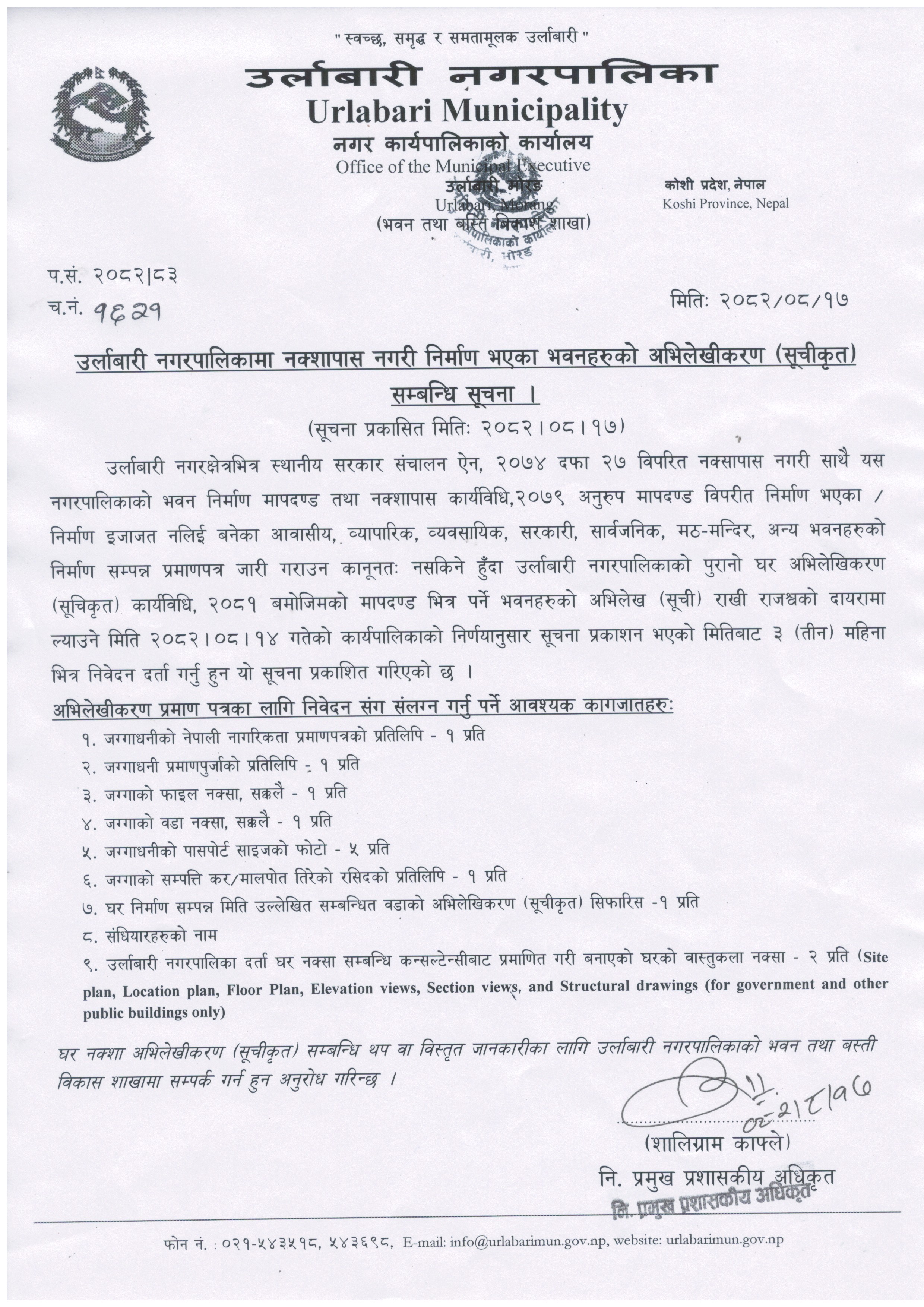 उर्लाबारी नगरपालिकामा नक्शापास नगरी निर्माण भएका भवनहरुको अभिलेखीकरण (सूचीकृत) सम्बन्धि सूचना ।