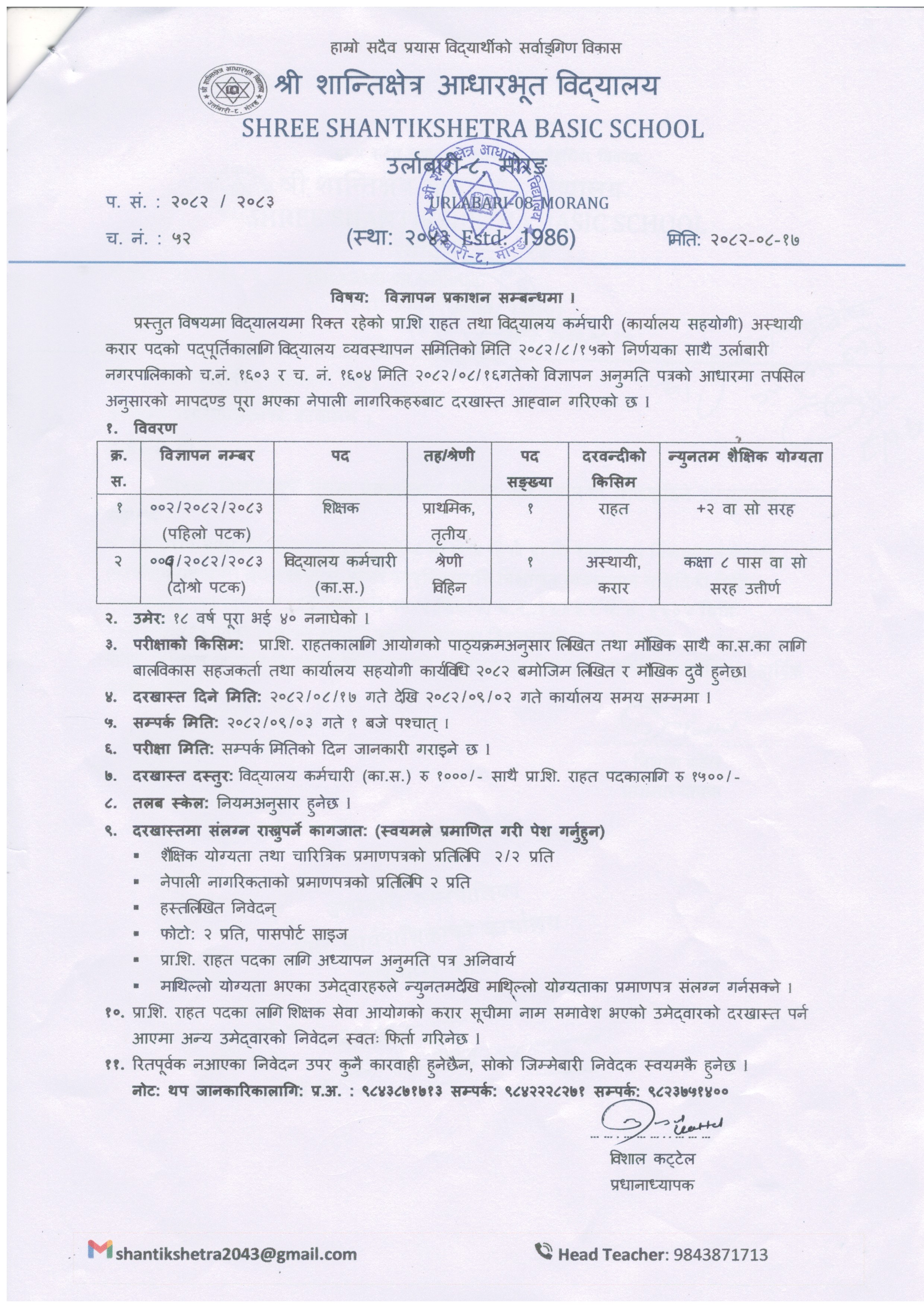 विज्ञापन प्रकाशन सम्बन्धमा । ( श्री शान्तिक्षेत्र आधारभूत विद्यालय)