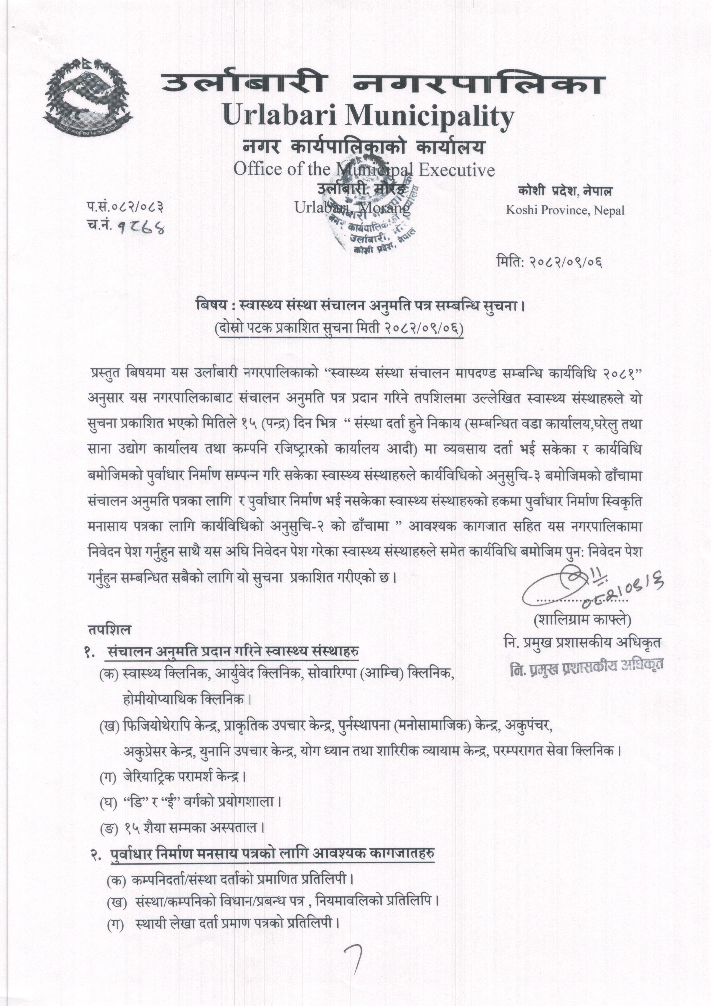 स्वास्थ्य संस्था संचालन अनुमति पत्र सम्बन्धि सूचना ।