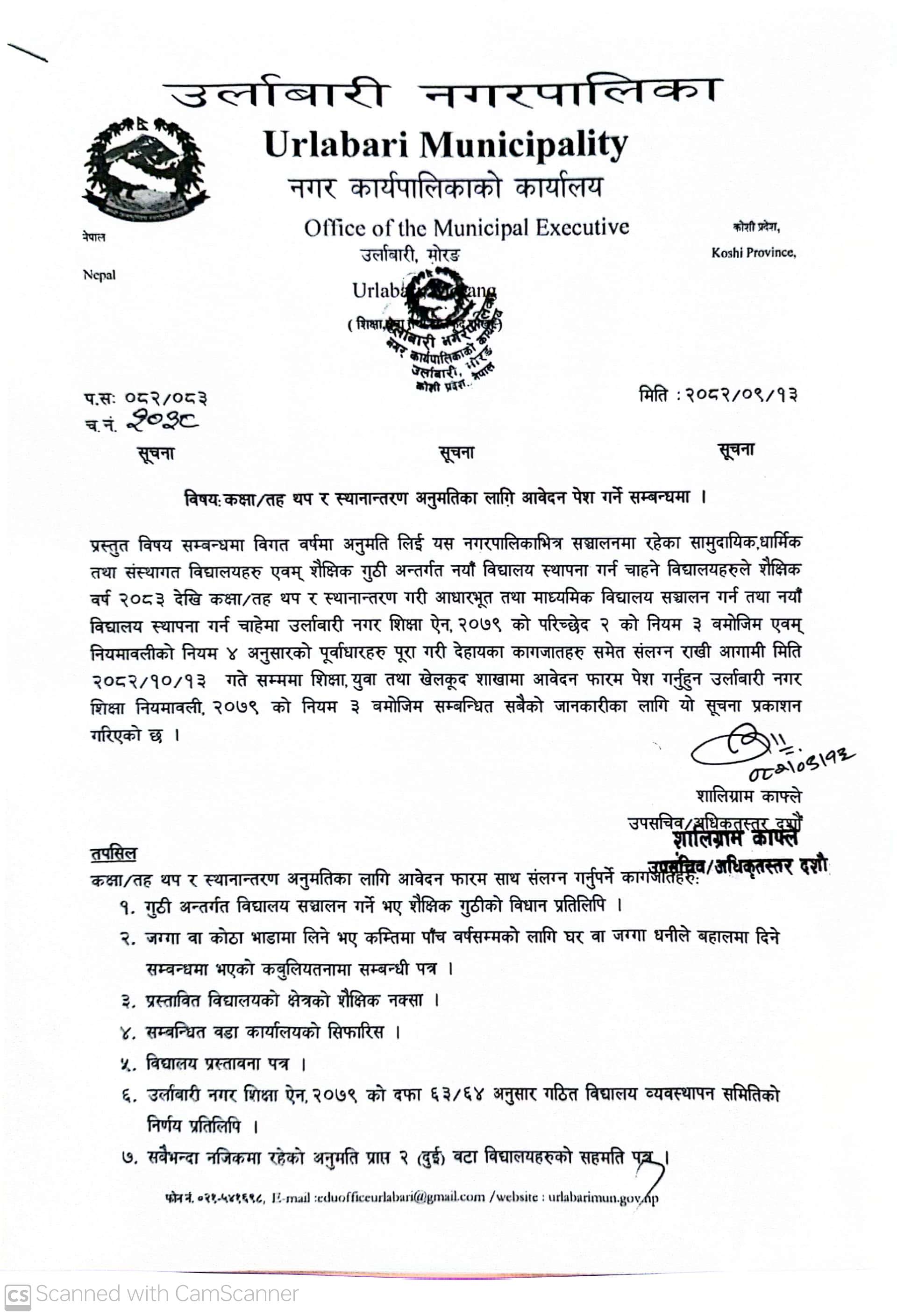 कक्षा/तह थप र स्थानान्तरण अनुमतिका लागि आवेदन पेश गर्ने सम्बन्धमा ।