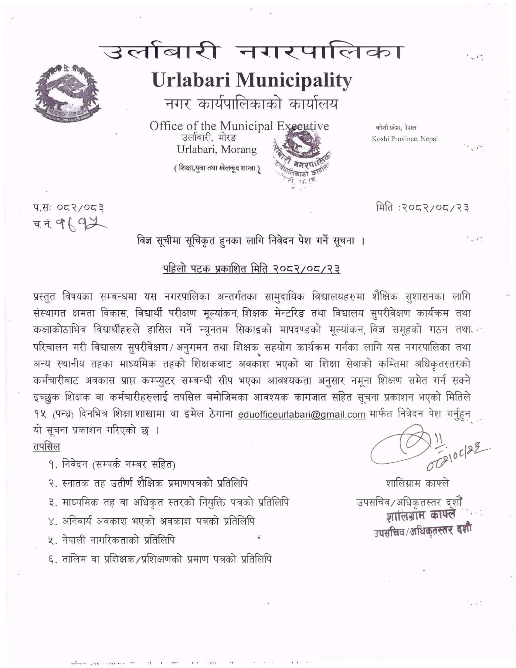 विज्ञ सूचीमा सूचिकृत हुनका लागि निवेदन पेश गर्ने सूचना ।