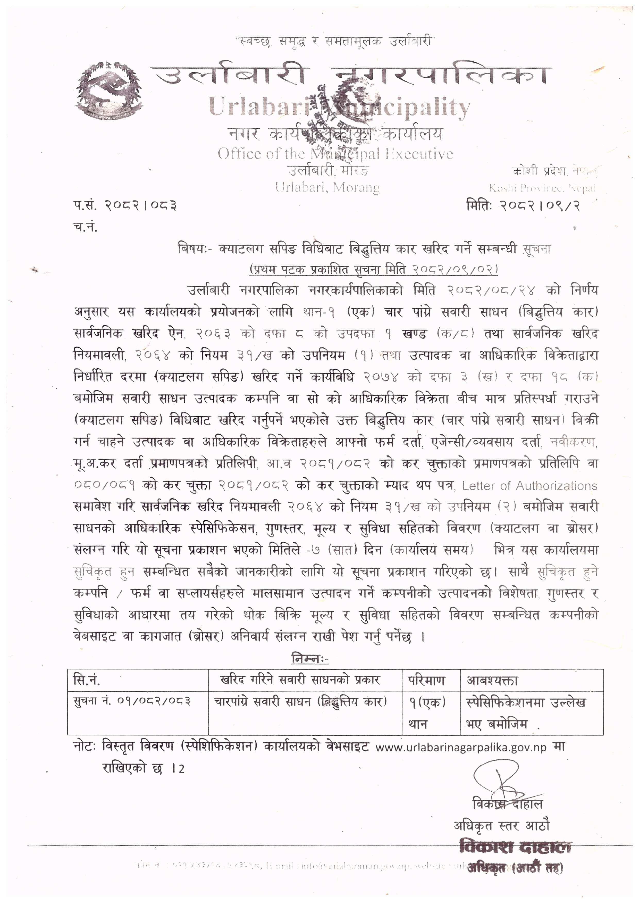 क्याटलग सपिङ विधिबाट बिद्धुत्तिय कार खरिद गर्ने सम्बन्धी सूचना ।