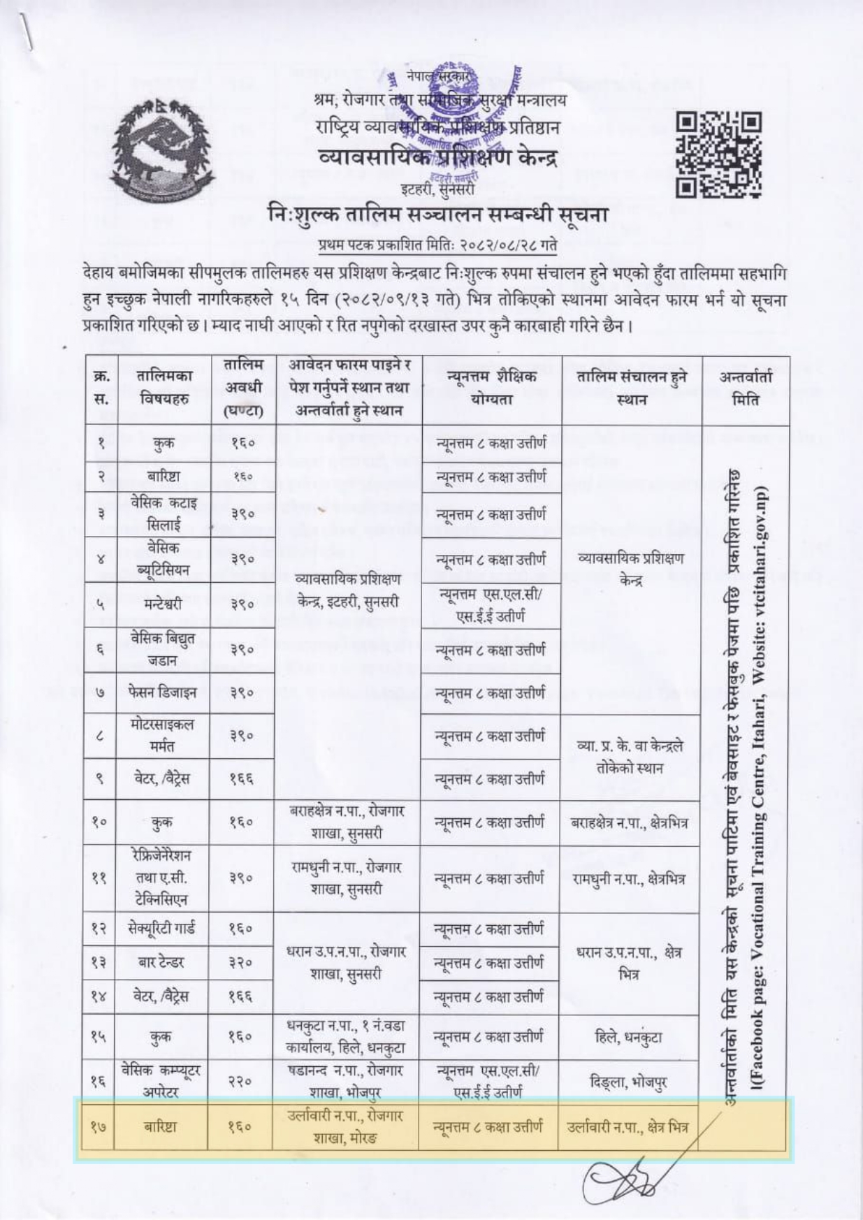 निःशुल्क तालिम सञ्चालन सम्बन्धी सूचना ।