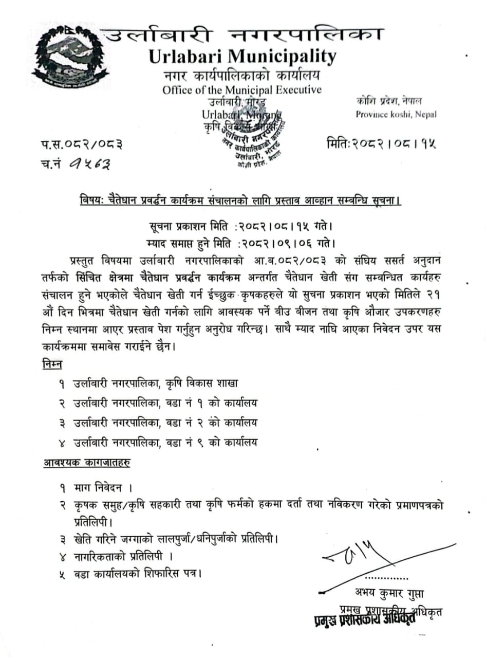 चैतेधान प्रवर्द्धन कार्यक्रम संचालनको लागि प्रस्ताव आव्हान सम्बन्धि सूचना ।