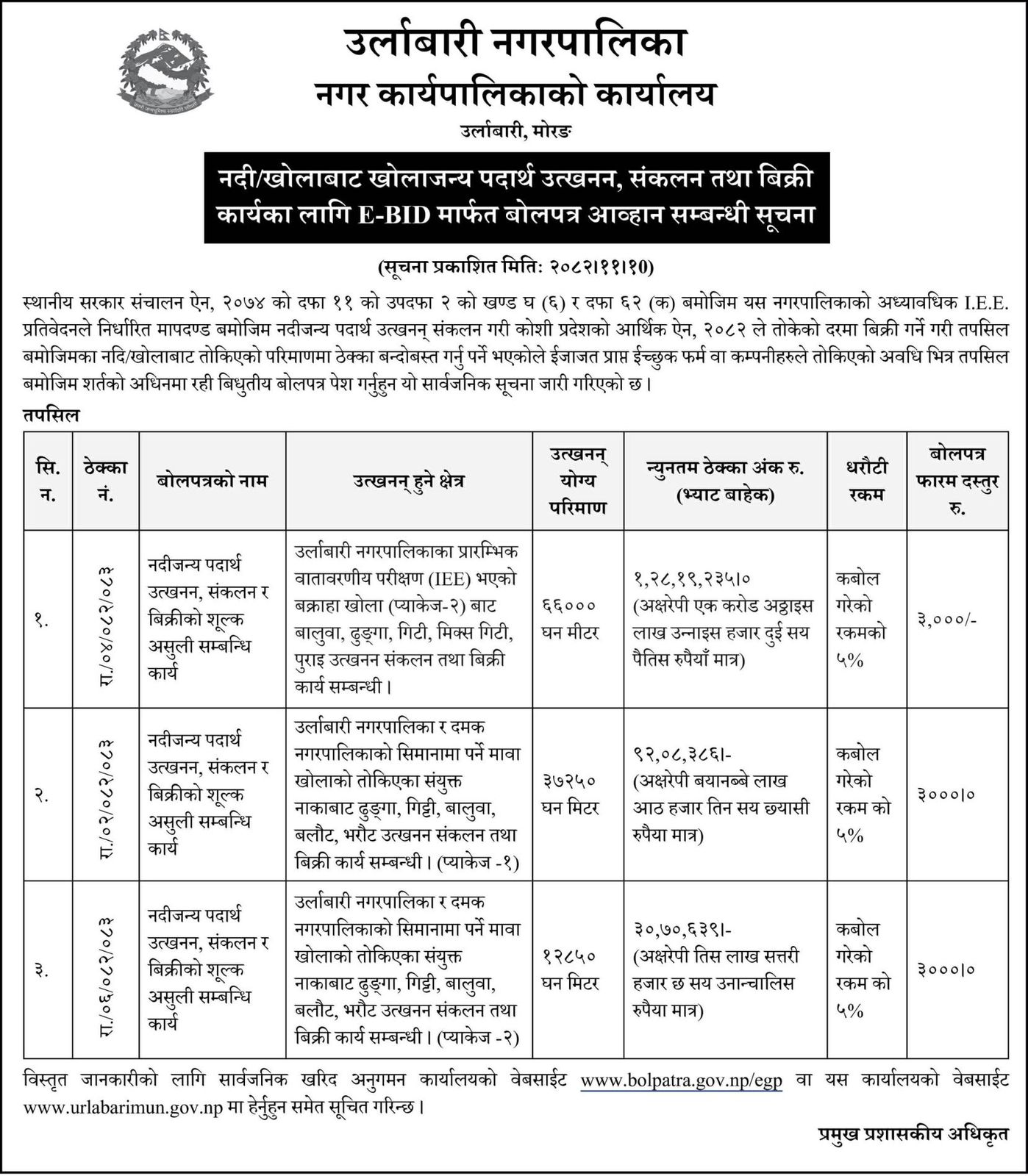 नदी/खोलाबाट खोलाजन्य पदार्थ उत्खनन, संकलन तथा बिक्री कार्यका लागि E-BID मार्फत बोलपत्र आव्हान सम्बन्धी सूचना ।