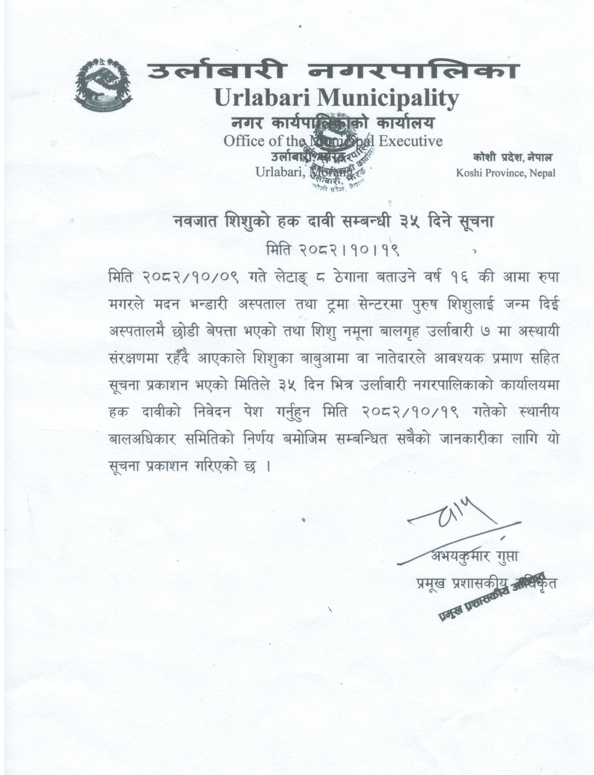 » नवजात शिशुको हक दावी सम्बन्धी ३५ दिने सूचना ।