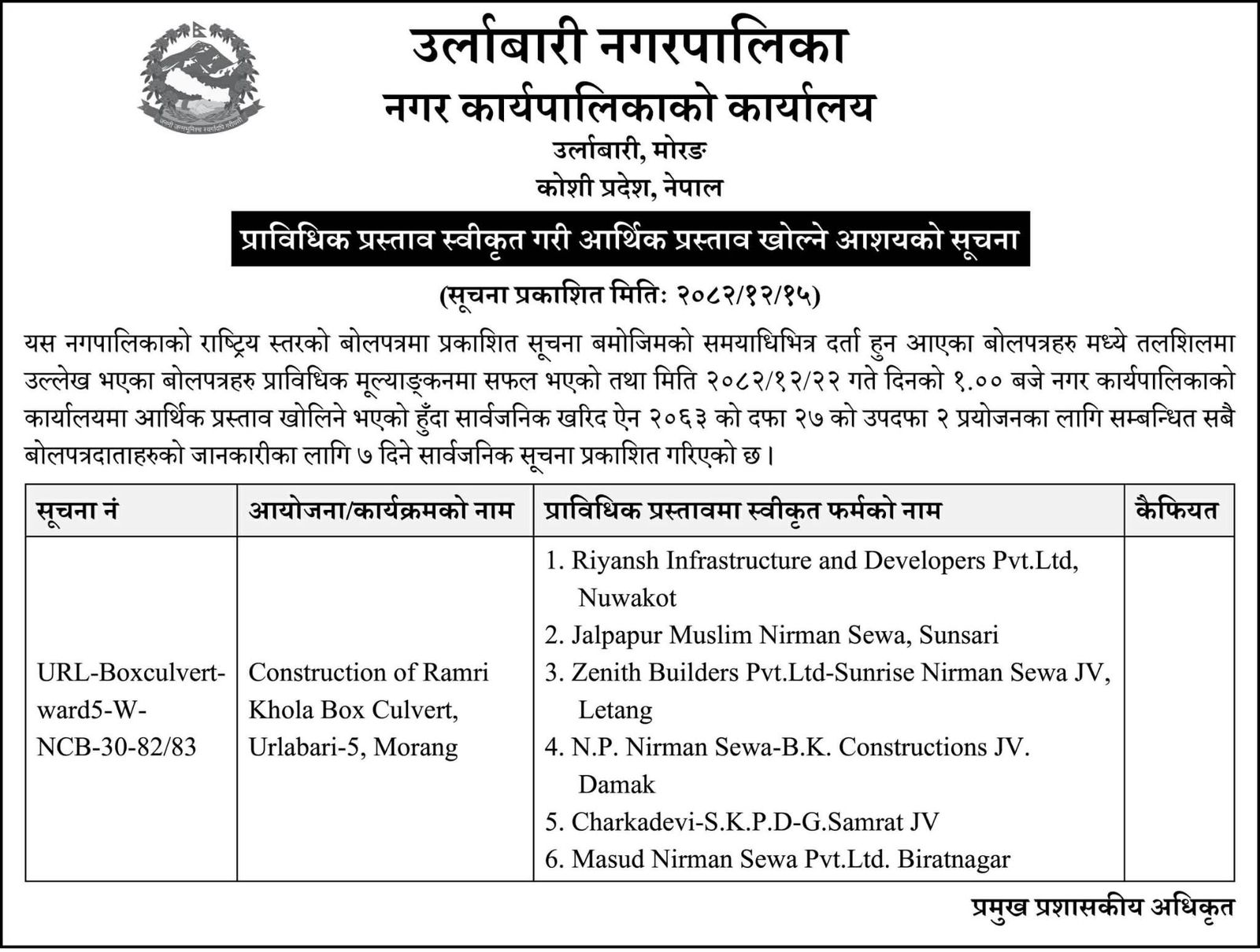 प्राविधिक प्रस्ताव स्वीकृत गरी आर्थिक प्रस्ताव खोल्ने आशयको सूचना (Construction of Ramri Khola Box Culvert, Urlabari-5, Morang)