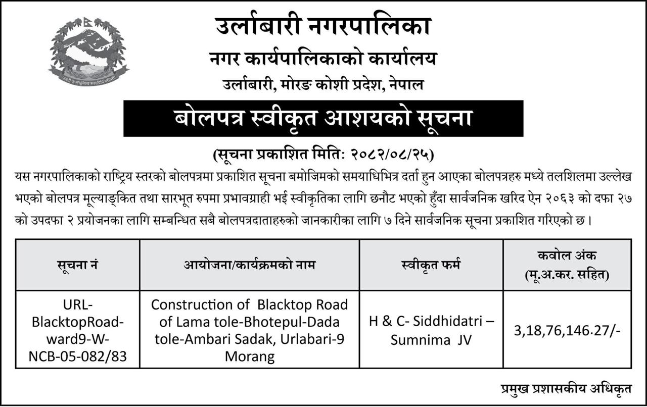 बोलपत्र स्वीकृत आशयको सूचना (Construction of Blacktop Road of Lama tole-Bhotepul-Dada tole- Ambari Sadak, Urlabari- 9 Morang)