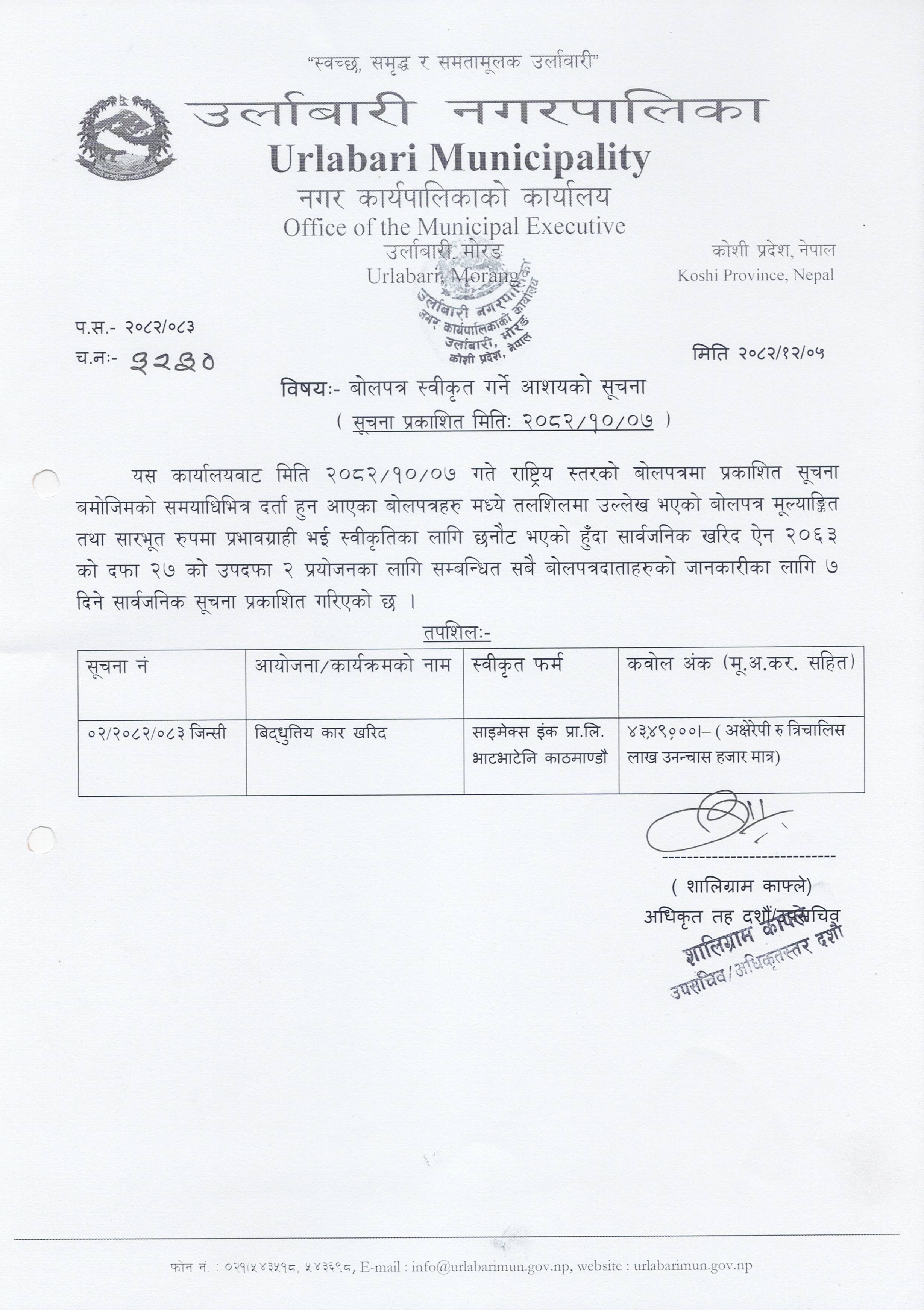 बोलपत्र स्वीकृत गर्ने आशयको सूचना । (विद्‍धुतिय कार खरिद)