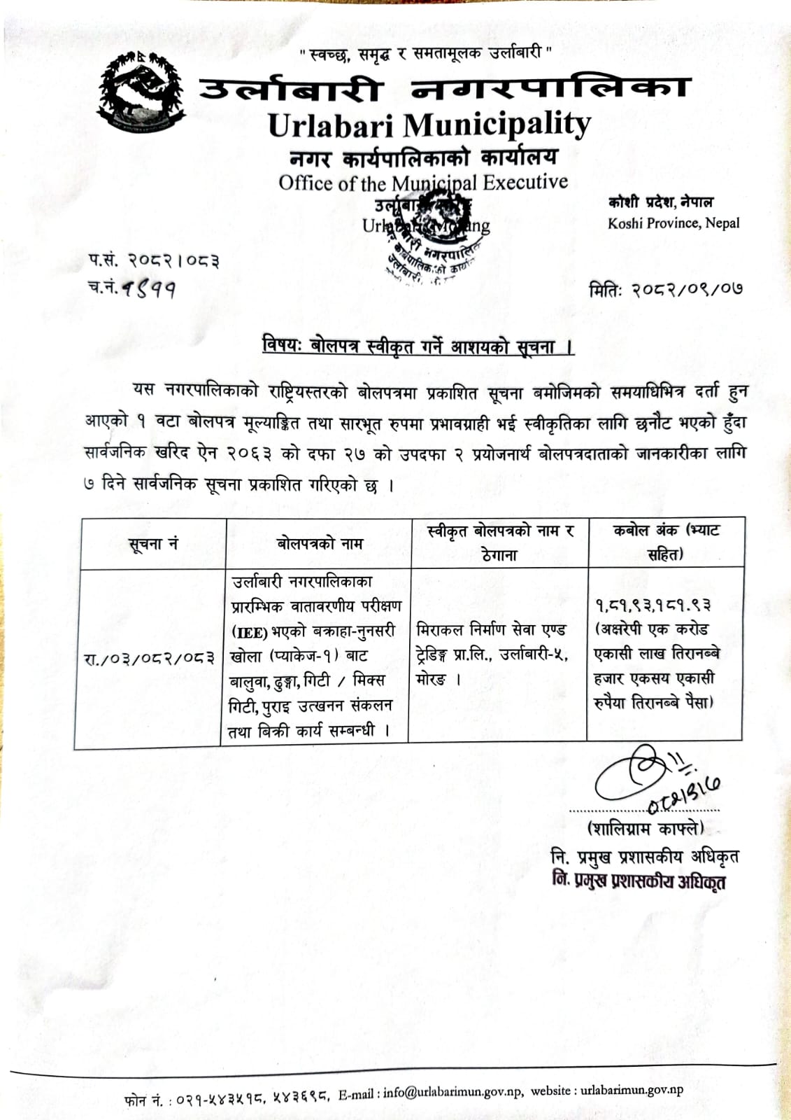 बोलपत्र स्वीकृत गर्ने आशयको सूचना ।