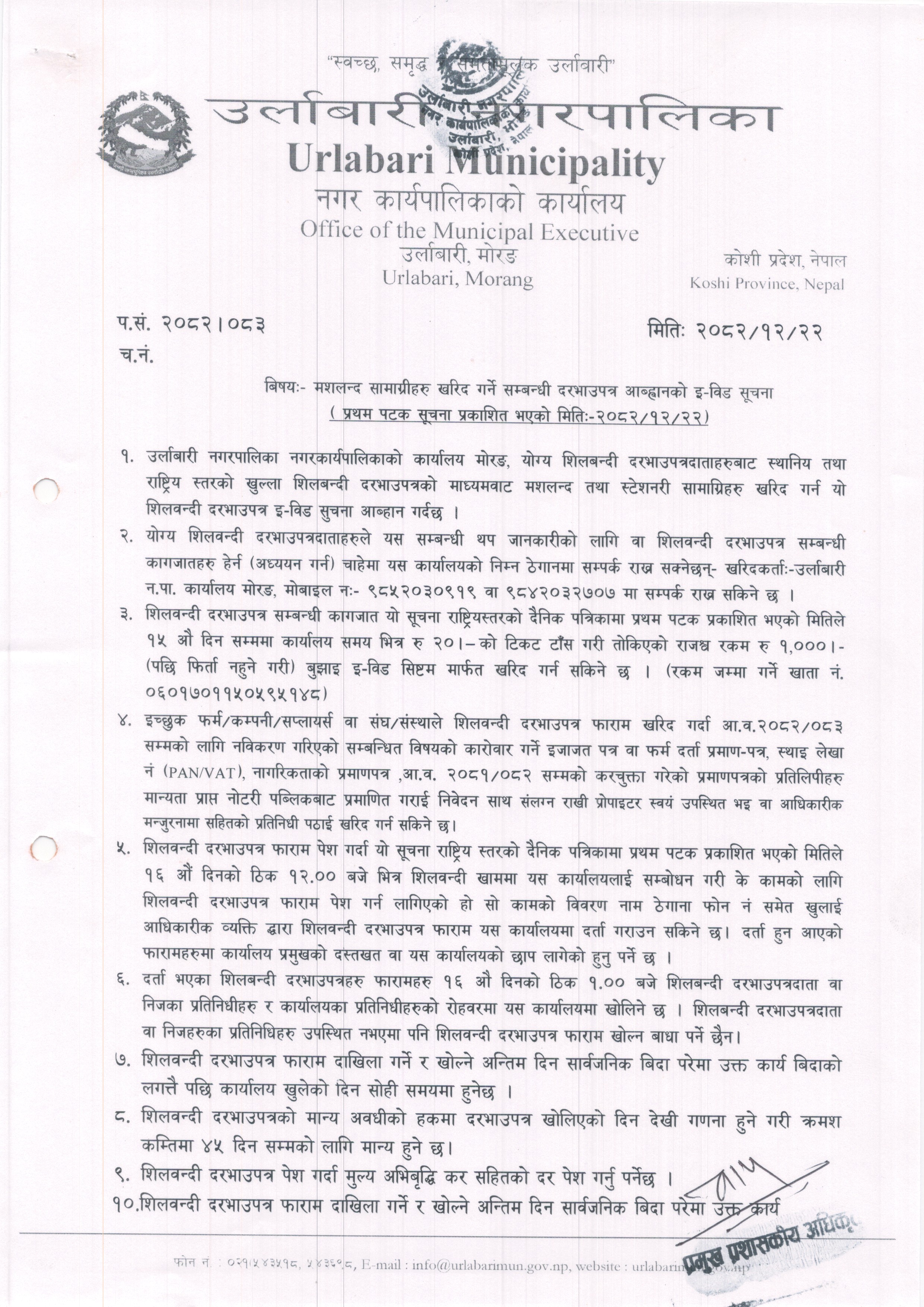 » मशलन्द सामाग्री खरिद गर्ने सम्बन्धी दरभाउपत्र आव्हानको इ-विड सूचना ।