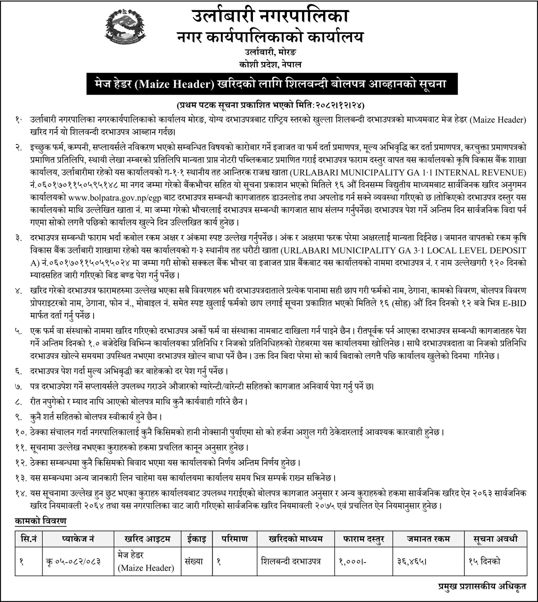 मेज हेडर (Maize Header) खरिदको लागि शिलवन्दी बोलपत्र आव्हानको सूचना।