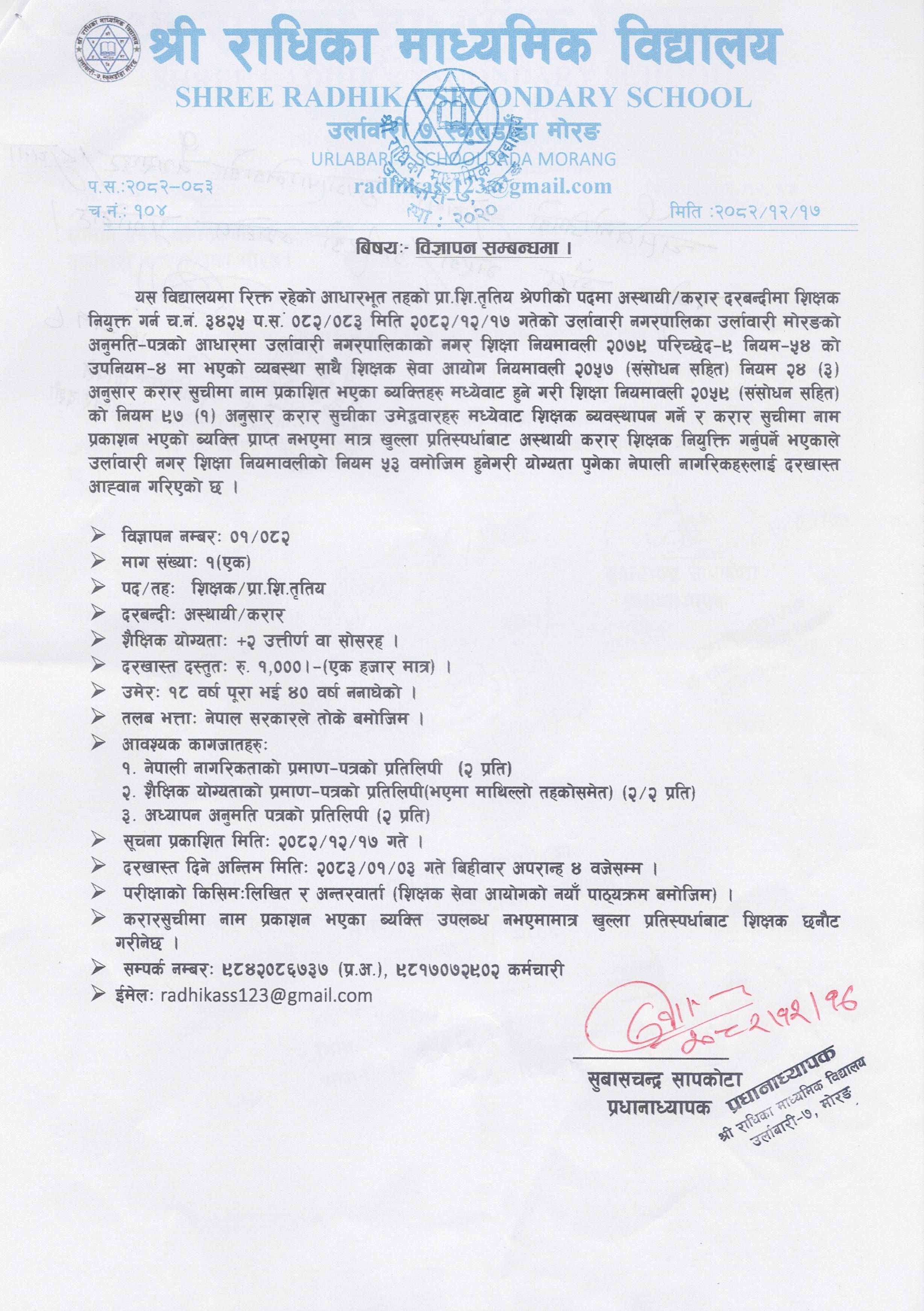 विज्ञापन सम्बन्धमा ।(राधिका मा.वि. उर्लाबारी-०७)