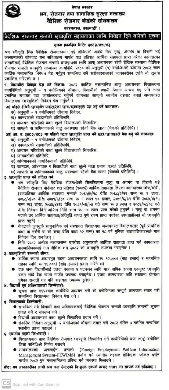 वैदेशिक रोजगार सन्तती छात्रवृत्ति सहायताका लागि निवेदन दिने बारेको सूचना ।
