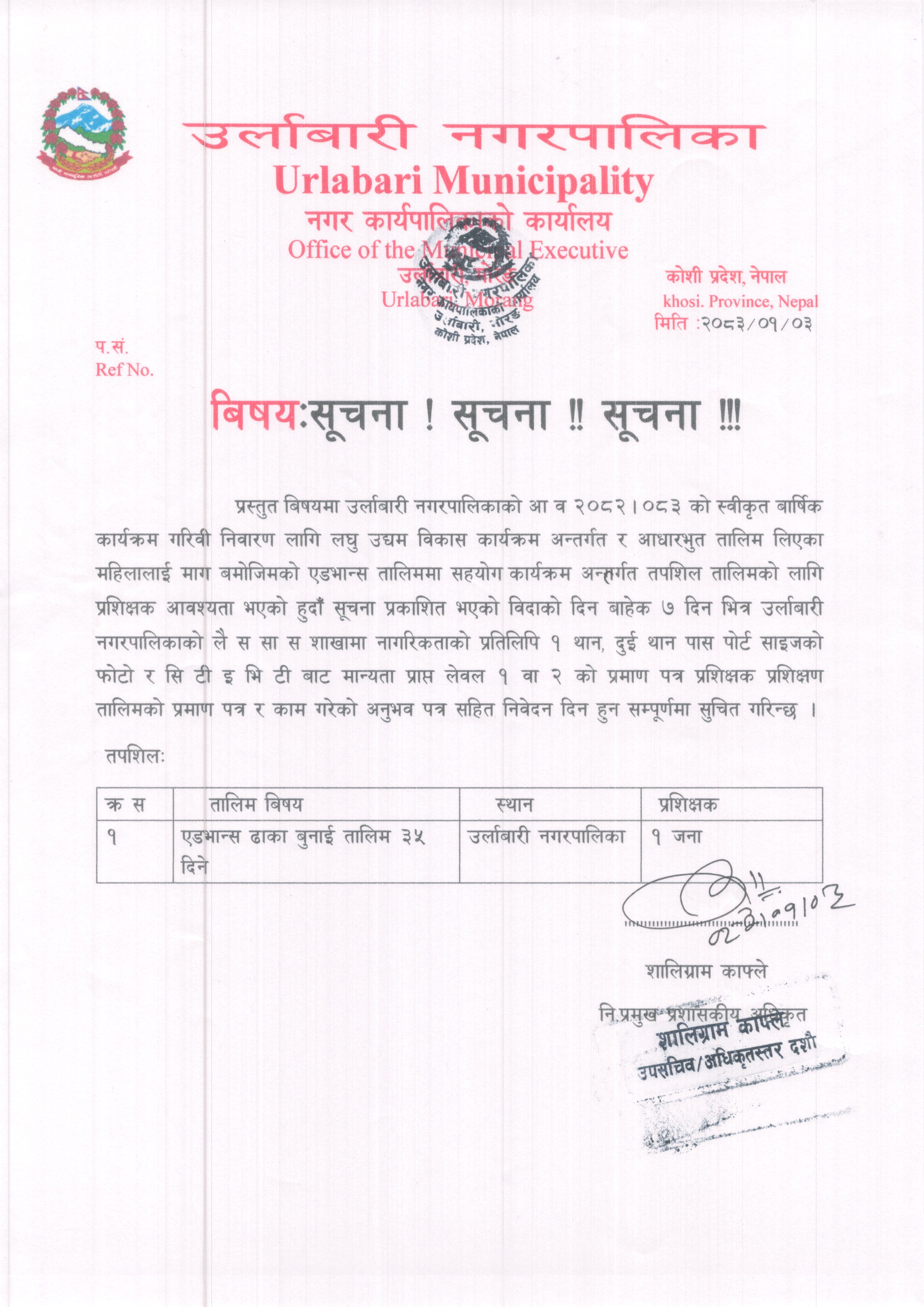 उर्लाबारी नगरपालिकाको आ .व. २०८२/०८३ को योजना तथा कार्यक्रमहरु