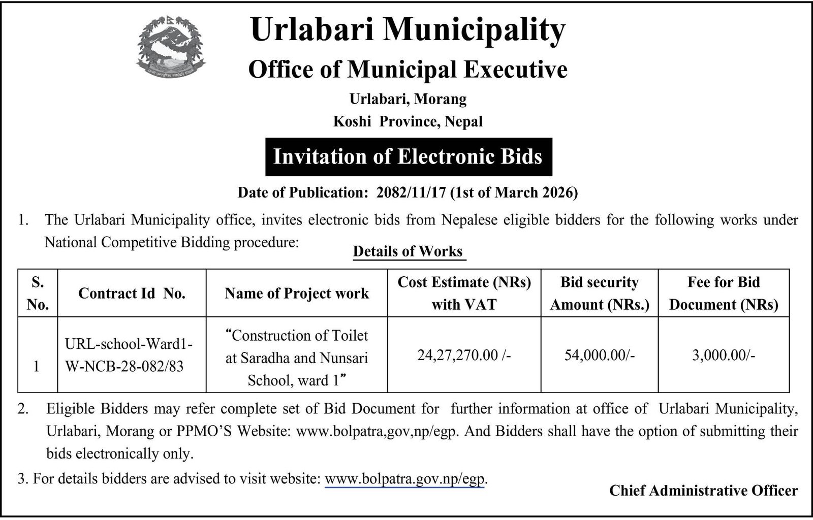 Invitation of Electronic Bids (Construction of Toilet at Saradha and Nunsari School, ward 1)