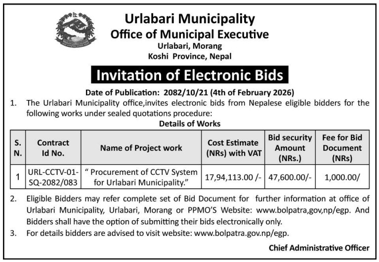 Invitation of Electronic Bids (Procurement of CCTV System for Urlabari Municipality.)