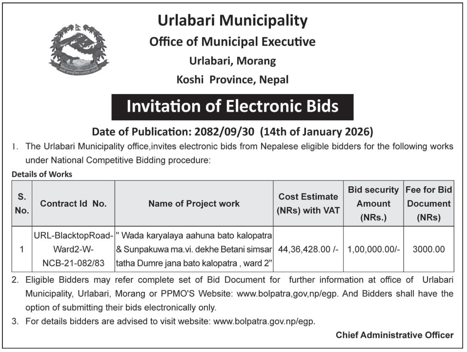 Invitation of Electronic Bids (Wada karyalaya aahuna bato kalopatra & Sunpakuwa ma.vi. dekhe Betani simsar tatha Dumre jana bato kalopatra , ward 2)