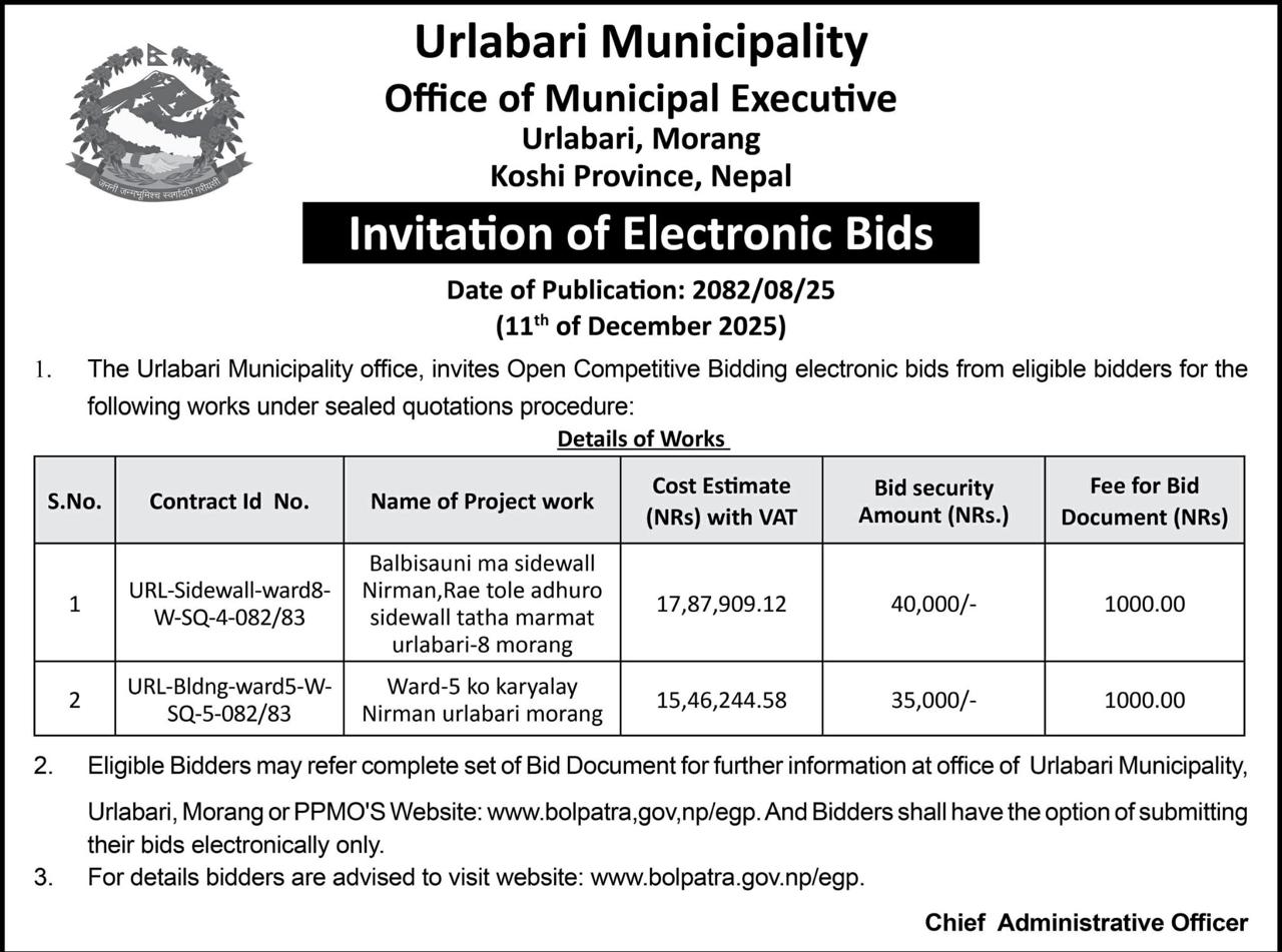 Invitation of Electronic Bids (Ward-5 ko karyalay Nirman urlabari morang)