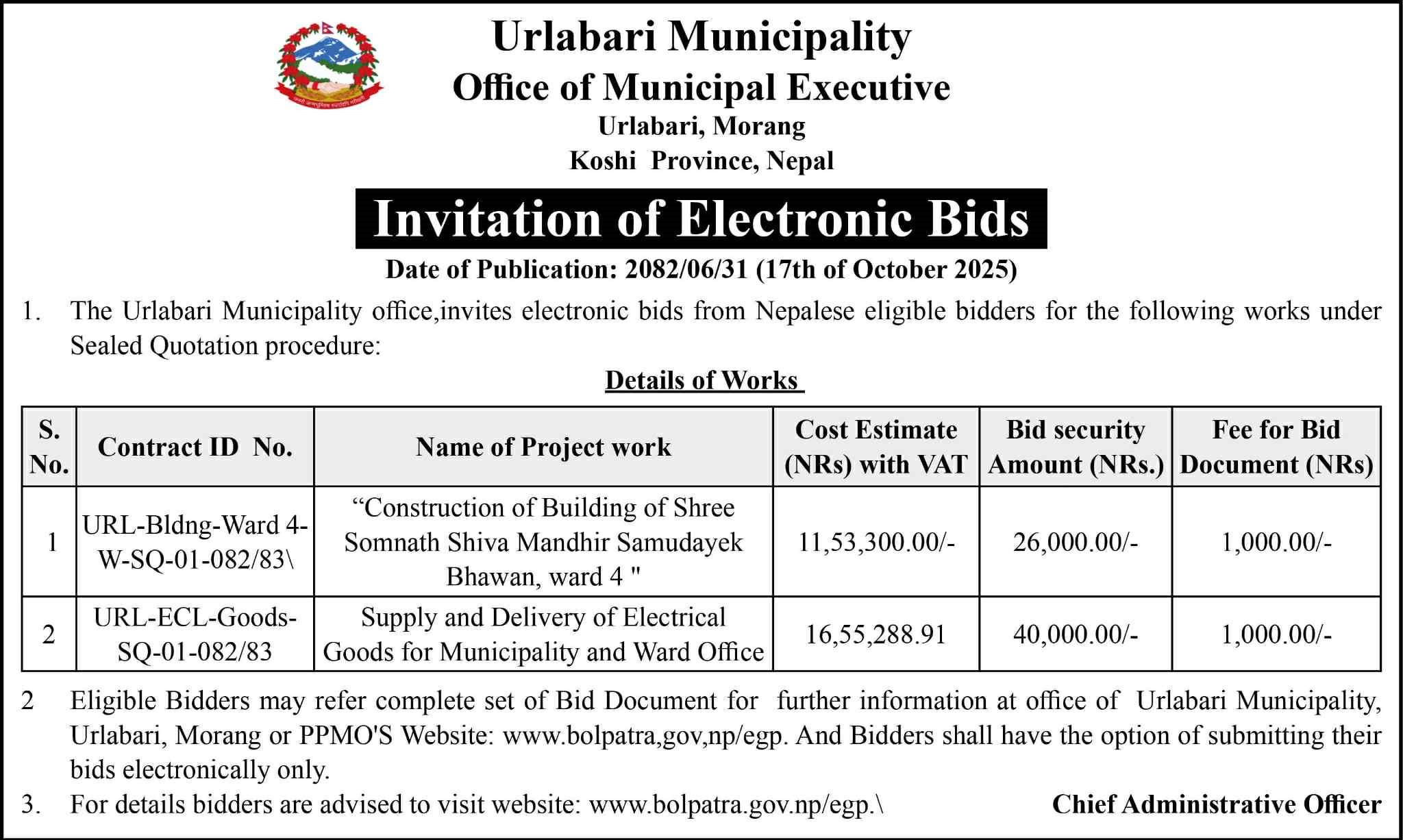 Invitation of Electronic Bids(Sauchalay Nirman (Durgapuri- 8,Mangalbare-3)& krishi Bajar Gate Nirman urlabari- 6,Morang)