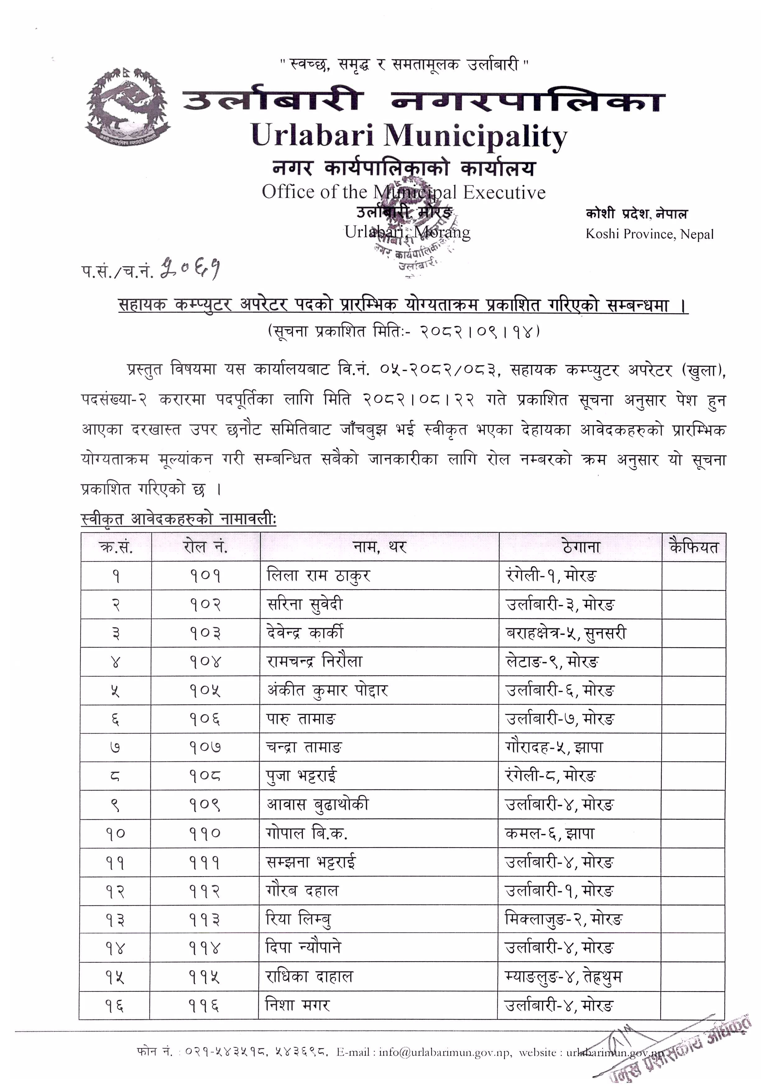 सहायक कम्प्युटर अपरेटर पदको प्रारम्भिक योग्यताक्रमको सूची प्रकाशन गरिएको सम्बन्धमा ।