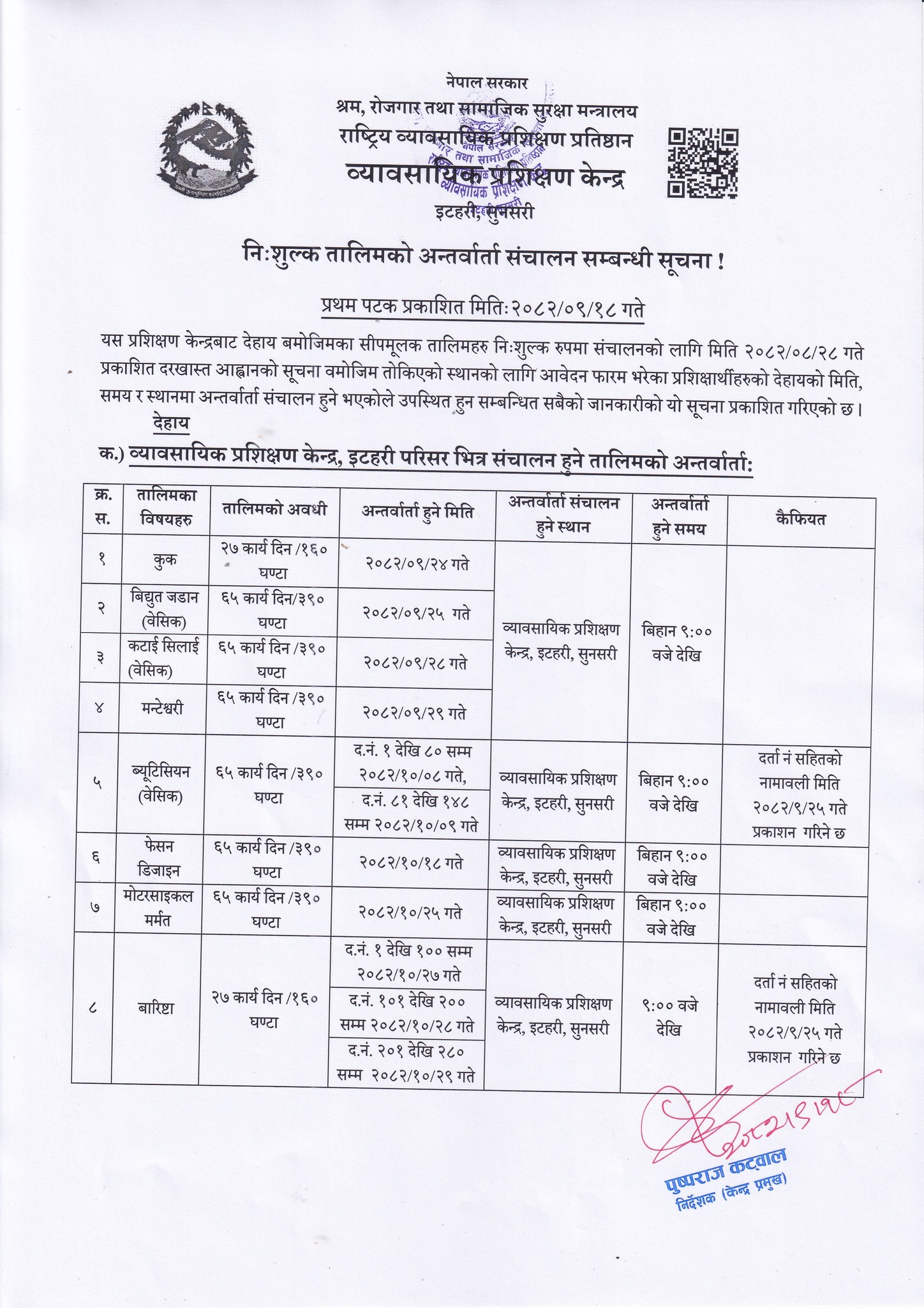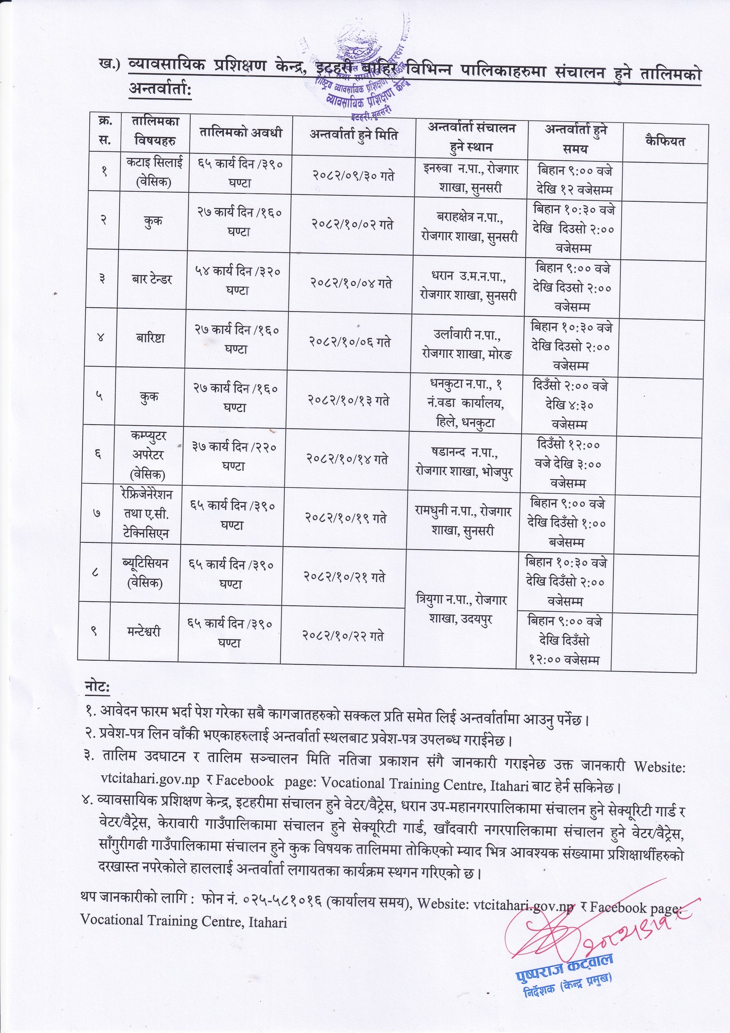 प्रशिक्षण केन्द्रबाट संचालन हुने निःशुल्क सीपमूलक तालिमको लागि अन्तरवार्ता संचालन सम्बन्धि सूचना ।