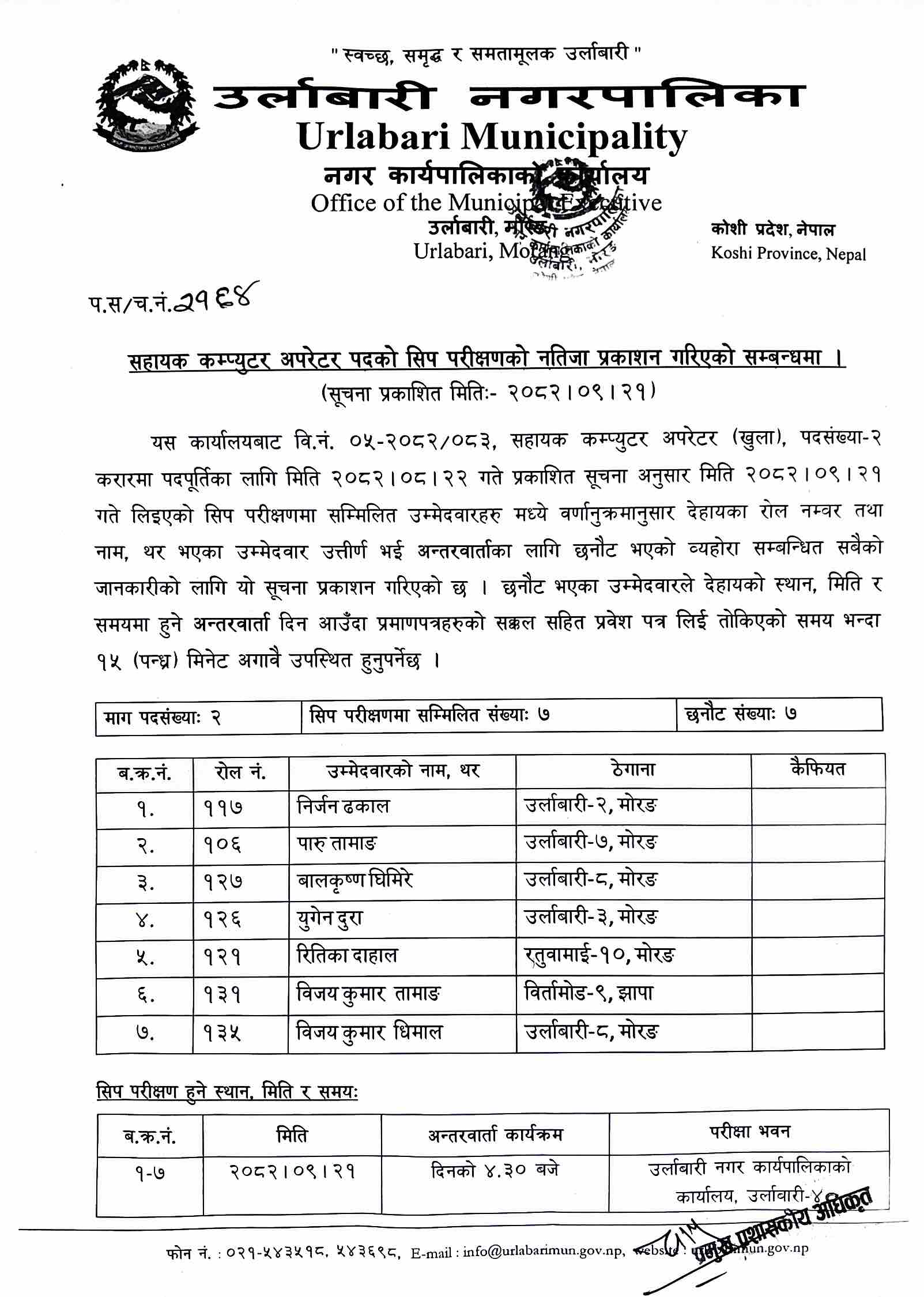 सहायक कम्प्युटर अपरेटर पदको सिप परीक्षणको नतिजा प्रकाशन गरिएको सूचना ।