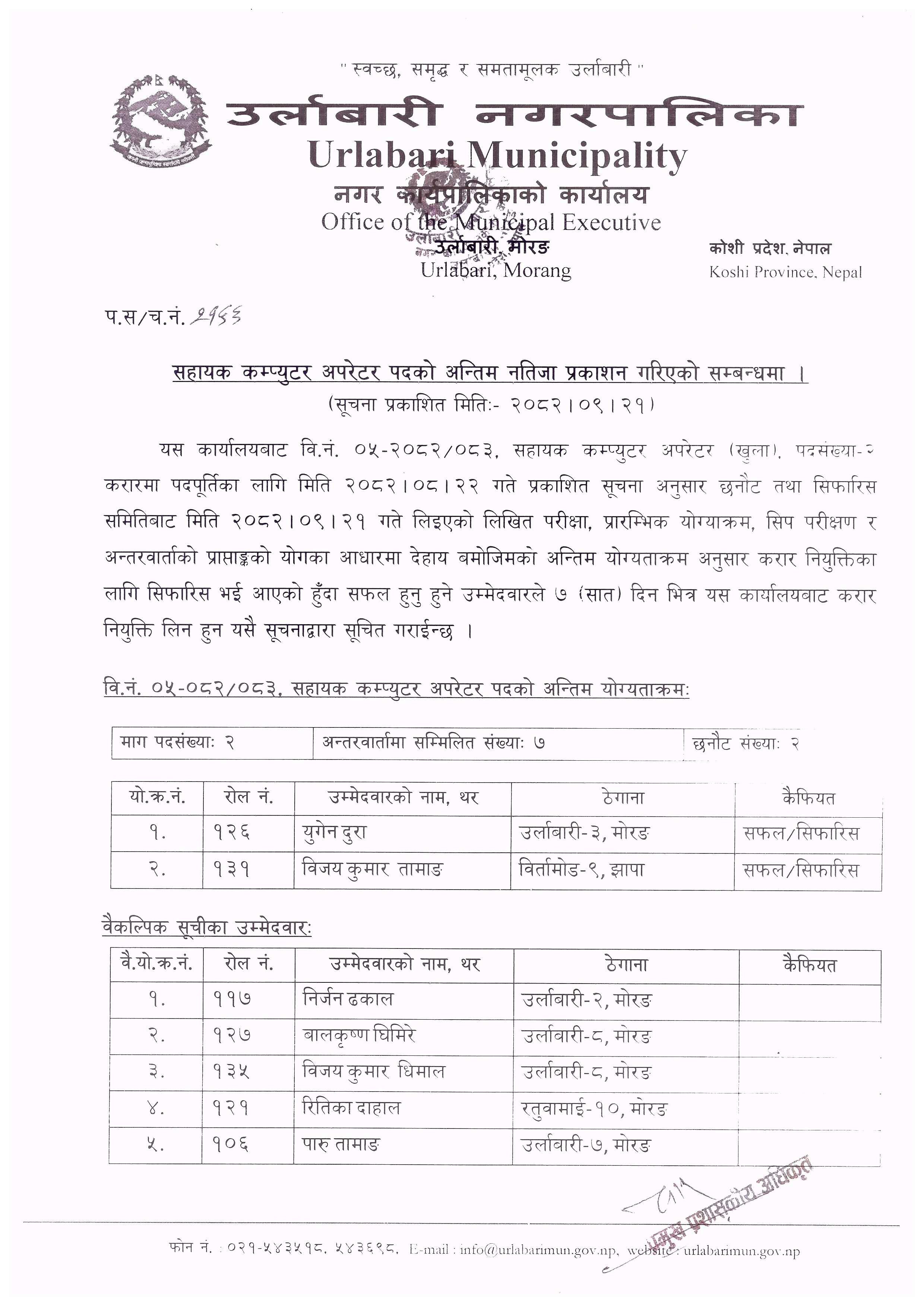 सहायक कम्प्युटर अपरेटर पदको अन्तिम नतिजा प्रकाशन गरिएको सूचना ।